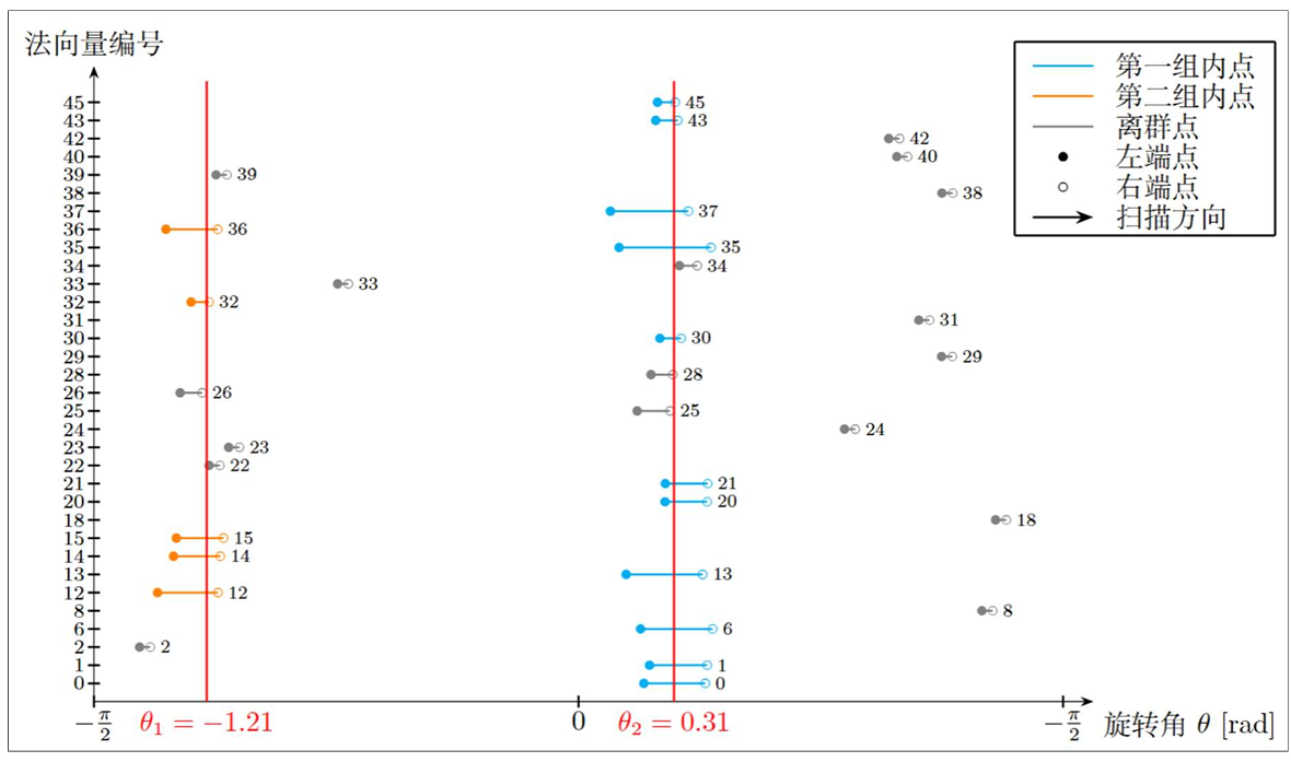 如果这时候我们反过来思考,不是去转这个向量然后看有多少法向量和它垂直,而是让每个法向量给出一个 $\theta$ 合法区间, 在这个合法区间内的向量基本与这个法向量垂直,对于一个真实存在的水平主方向,一定和许多属于这个方向的线的法向量垂直, 所以如果有很多个法向量给出的合法区间有重叠,那么则认为存在一个水平主方向,其 $\theta$ 落在这个区间内,如果有多个重叠, 那就有多个水平主方向。这样,水平主方向的数量、方向以及其内点就都确定了!